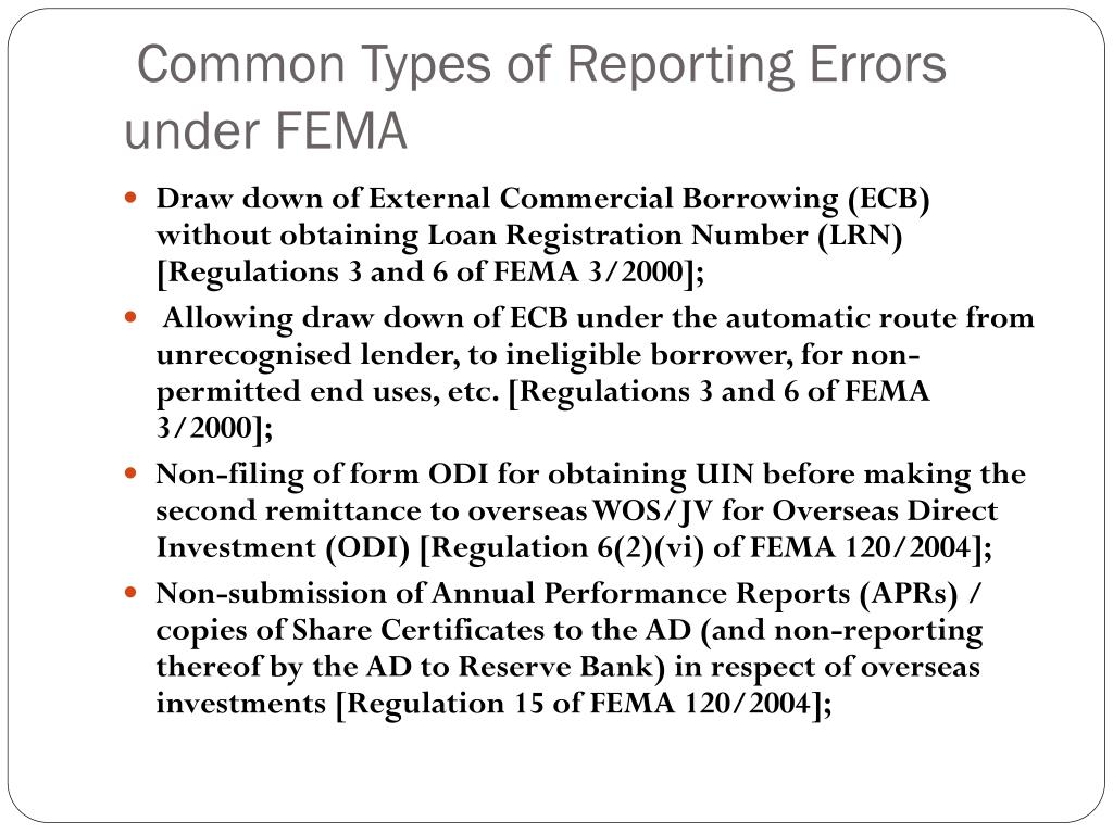 Common Types of Reporting Errors under FEMA • Delay in submission of the Advance Reporting Format in respect of Foreign Direct Investment (FDI) to the concerned Regional Office of the Reserve Bank [paragraph 9 (1) (A) of Schedule I to FEMA 20/2000]; • Delay in filing of details after issue of eligible instruments under FDI within 30 days in form FC-GPR to the concerned Regional Office of the Reserve Bank [paragraph 9 (1) (B) of Schedule I to FEMA 20/2000]; • Delay in filing of details pertaining to transfer of shares for FDI transactions in form FC-TRS by resident individual/companies [Regulation 10 (A) (b) of FEMA 20/2000]; etc.