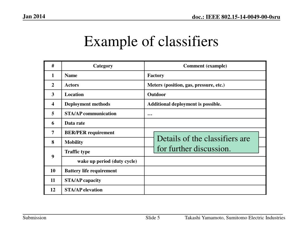Example of classifiers Details of the classifiers arefor further discussion. Takashi Yamamoto, Sumitomo Electric Industries