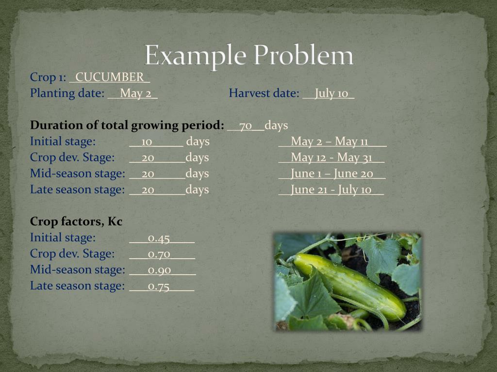 Example Problem Crop 1: _CUCUMBER_ Planting date: __May 2_Harvest date: __July 10_ Duration of total growing period: __70__days Initial stage: __10_____ days __May 2 – May 11___ Crop dev. Stage:__20_____days __May 12 - May 31__ Mid-season stage:__20_____days __June 1 – June 20__ Late season stage:__20_____days __June 21 - July 10__ Crop factors, Kc Initial stage:___0.45____ Crop dev. Stage: ___0.70____ Mid-season stage:___0.90____ Late season stage:___0.75____