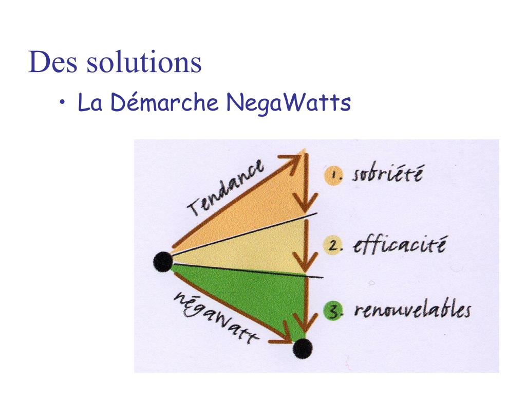 Des solutions La Démarche NegaWatts L’énergie la moins chère et la moins polluante est celle… que l’on ne produit pas, que l’on ne transporte pas, que l’on ne consomme pas…