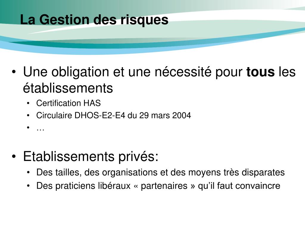 La Gestion des risques • Une obligation et une nécessité pour tous les établissements • Certification HAS • Circulaire DHOS-E2-E4 du 29 mars 2004 • … • Etablissements privés: • Des tailles, des organisations et des moyens très disparates • Des praticiens libéraux « partenaires » qu’il faut convaincre