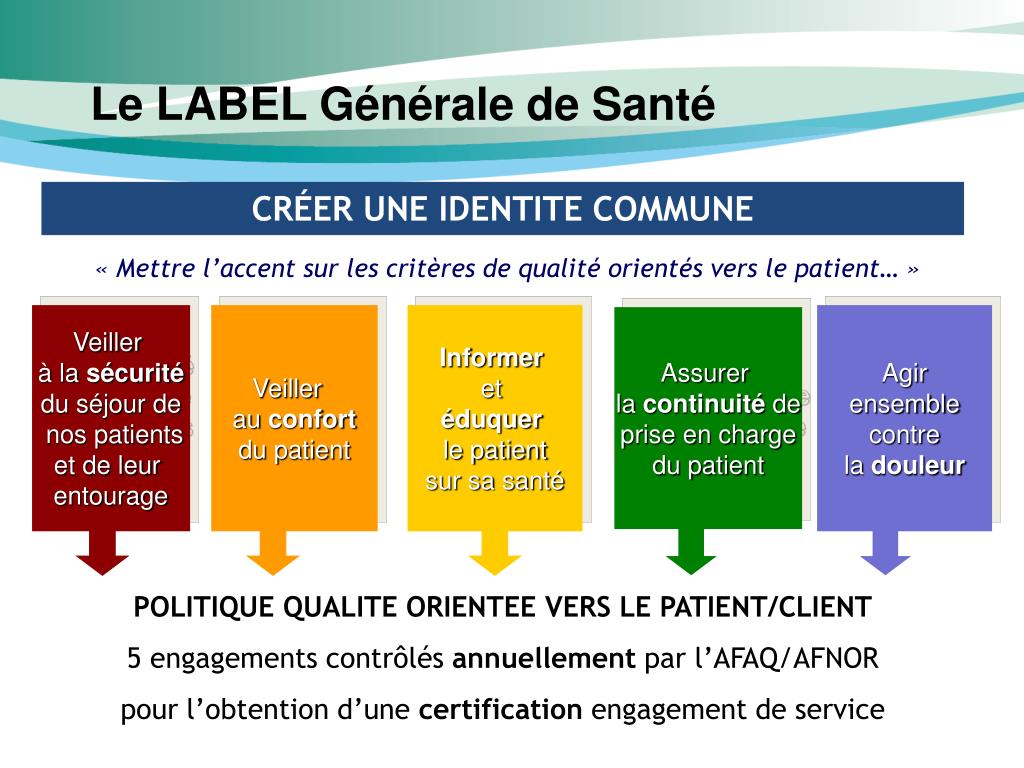 Le LABEL Générale de Santé CRÉER UNE IDENTITE COMMUNE « Mettre l’accent sur les critères de qualité orientés vers le patient… » Veiller à la sécurité du séjour de nos patients et de leur entourage Veiller au confort du patient Informer et éduquer le patient sur sa santé Assurer la continuité de prise en charge du patient Agir ensemble contre la douleur POLITIQUE QUALITE ORIENTEE VERS LE PATIENT/CLIENT 5 engagements contrôlés annuellement par l’AFAQ/AFNOR pour l’obtention d’une certification engagement de service