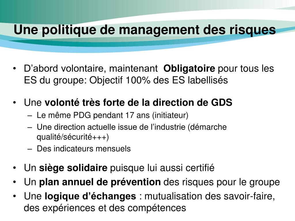 Une politique de management des risques • D’abord volontaire, maintenant Obligatoire pour tous les ES du groupe: Objectif 100% des ES labellisés • Une volonté très forte de la direction de GDS • Le même PDG pendant 17 ans (initiateur) • Une direction actuelle issue de l’industrie(démarche qualité/sécurité+++) • Des indicateurs mensuels • Un siège solidaire puisque lui aussi certifié • Un plan annuel de prévention des risques pour le groupe • Une logique d’échanges : mutualisation des savoir-faire, des expériences et des compétences