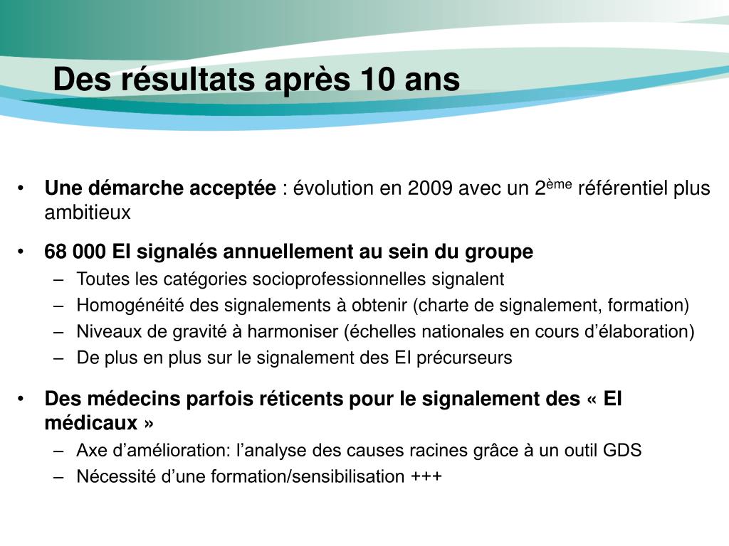 Des résultats après 10 ans • Une démarche acceptée : évolution en 2009 avec un 2ème référentiel plus ambitieux • 68 000 EI signalés annuellement au sein du groupe • Toutes les catégories socioprofessionnelles signalent • Homogénéité des signalements à obtenir (charte de signalement, formation) • Niveaux de gravité à harmoniser (échelles nationales en cours d’élaboration) • De plus en plus sur le signalement des EI précurseurs • Des médecins parfois réticents pour le signalement des « EI médicaux » • Axe d’amélioration: l’analyse des causes racines grâce à un outil GDS • Nécessité d’une formation/sensibilisation +++