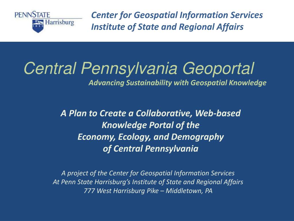 Center for Geospatial Information Services Institute of State and Regional Affairs Central Pennsylvania Geoportal Advancing Sustainability with Geospatial Knowledge A Plan to Create a Collaborative, Web-based Knowledge Portal of the Economy, Ecology, and Demography of Central Pennsylvania A project of the Center for Geospatial Information Services At Penn State Harrisburg’s Institute of State and Regional Affairs 777 West Harrisburg Pike – Middletown, PA