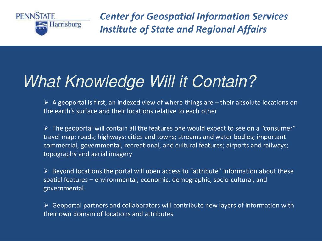 Center for Geospatial Information Services Institute of State and Regional Affairs What Knowledge Will it Contain? • A geoportal is first, an indexed view of where things are – their absolute locations on the earth’s surface and their locations relative to each other • The geoportal will contain all the features one would expect to see on a “consumer” travel map: roads; highways; cities and towns; streams and water bodies; important commercial, governmental, recreational, and cultural features; airports and railways; topography and aerial imagery • Beyond locations the portal will open access to “attribute” information about these spatial features – environmental, economic, demographic, socio-cultural, and governmental. • Geoportal partners and collaborators will contribute new layers of information with their own domain of locations and attributes