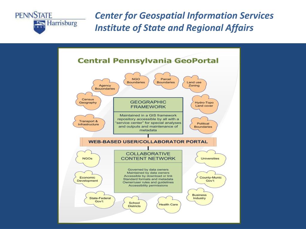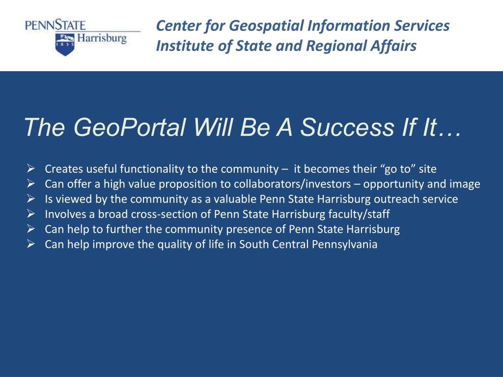 Center for Geospatial Information Services Institute of State and Regional Affairs The GeoPortal Will Be A Success If It… • Creates useful functionality to the community – it becomes their “go to” site • Can offer a high value proposition to collaborators/investors – opportunity and image • Is viewed by the community as a valuable Penn State Harrisburg outreach service • Involves a broad cross-section of Penn State Harrisburg faculty/staff • Can help to further the community presence of Penn State Harrisburg • Can help improve the quality of life in South Central Pennsylvania