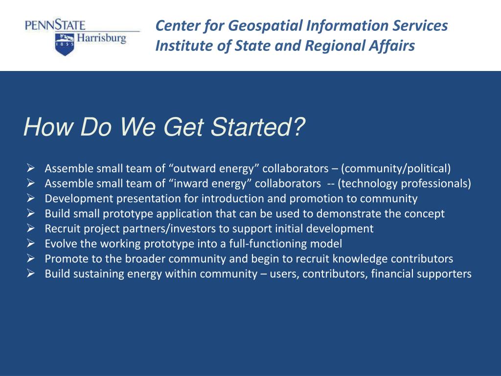 Center for Geospatial Information Services Institute of State and Regional Affairs How Do We Get Started? • Assemble small team of “outward energy” collaborators – (community/political) • Assemble small team of “inward energy” collaborators -- (technology professionals) • Development presentation for introduction and promotion to community • Build small prototype application that can be used to demonstrate the concept • Recruit project partners/investors to support initial development • Evolve the working prototype into a full-functioning model • Promote to the broader community and begin to recruit knowledge contributors • Build sustaining energy within community – users, contributors, financial supporters