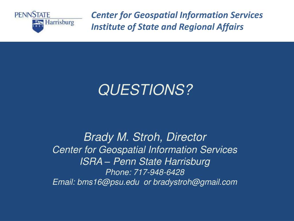 Center for Geospatial Information Services Institute of State and Regional Affairs QUESTIONS? Brady M. Stroh, Director Center for Geospatial Information Services ISRA – Penn State Harrisburg Phone: 717-948-6428 Email: bms16@psu.edu or bradystroh@gmail.com