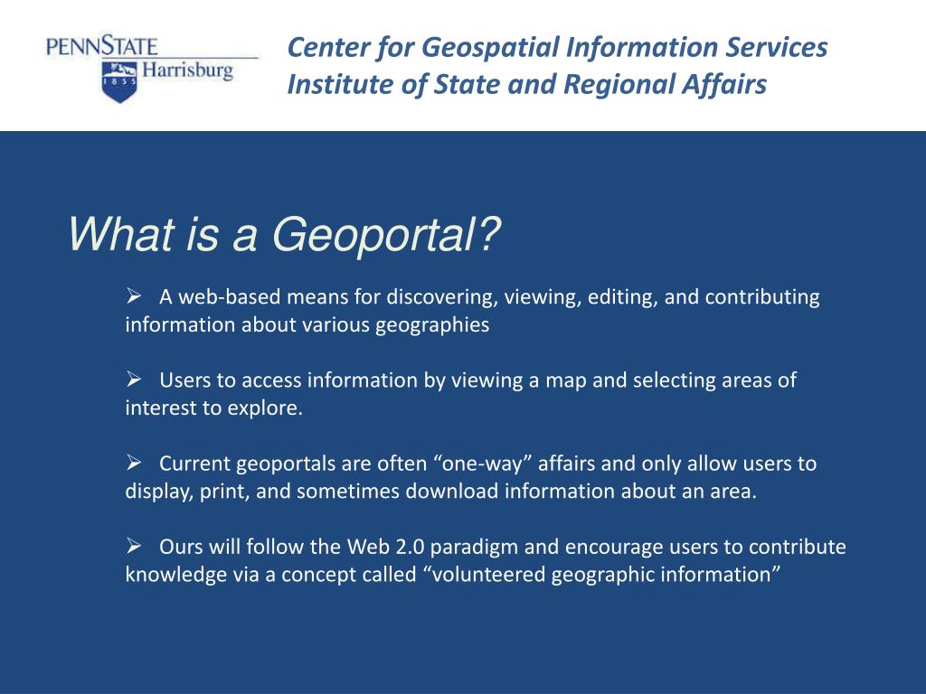 Center for Geospatial Information Services Institute of State and Regional Affairs What is a Geoportal? • A web-based means for discovering, viewing, editing, and contributing information about various geographies • Users to access information by viewing a map and selecting areas of interest to explore. • Current geoportals are often “one-way” affairs and only allow users to display, print, and sometimes download information about an area. • Ours will follow the Web 2.0 paradigm and encourage users to contribute knowledge via a concept called “volunteered geographic information”