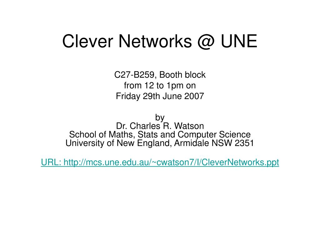 Clever Networks @ UNE C27-B259, Booth block from 12 to 1pm on Friday 29th June 2007 by Dr. Charles R. WatsonSchool of Maths, Stats and Computer ScienceUniversity of New England, Armidale NSW 2351 URL: http://mcs.une.edu.au/~cwatson7/I/CleverNetworks.ppt