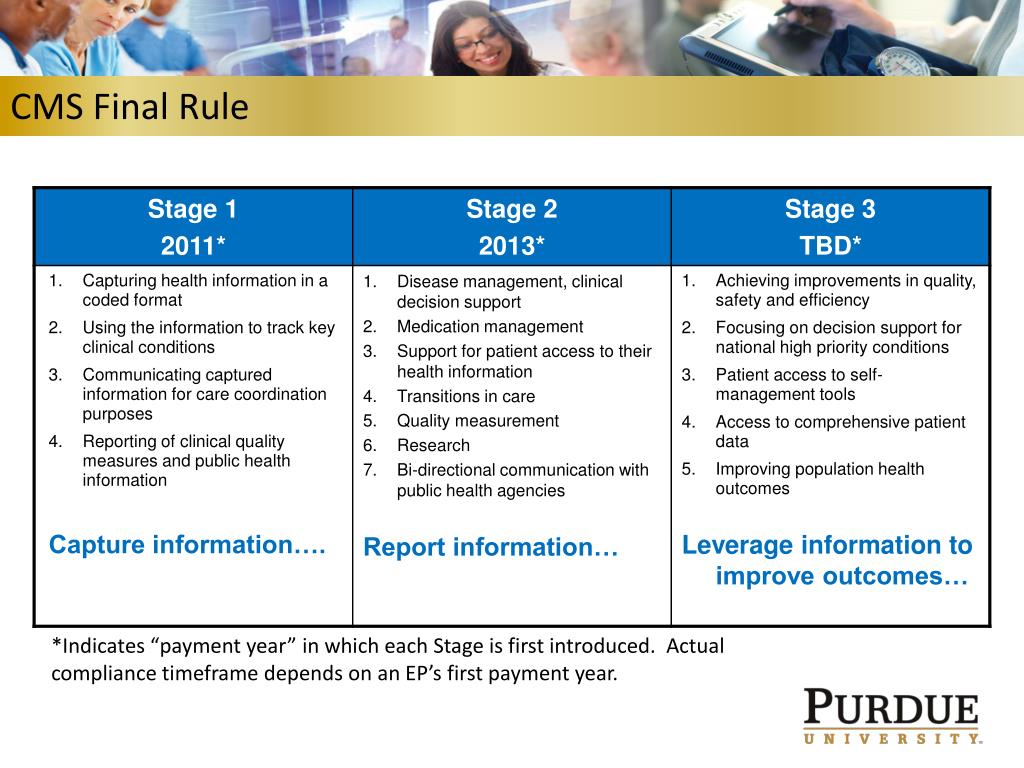 CMS Final Rule *Indicates “payment year” in which each Stage is first introduced. Actual compliance timeframe depends on an EP’s first payment year.