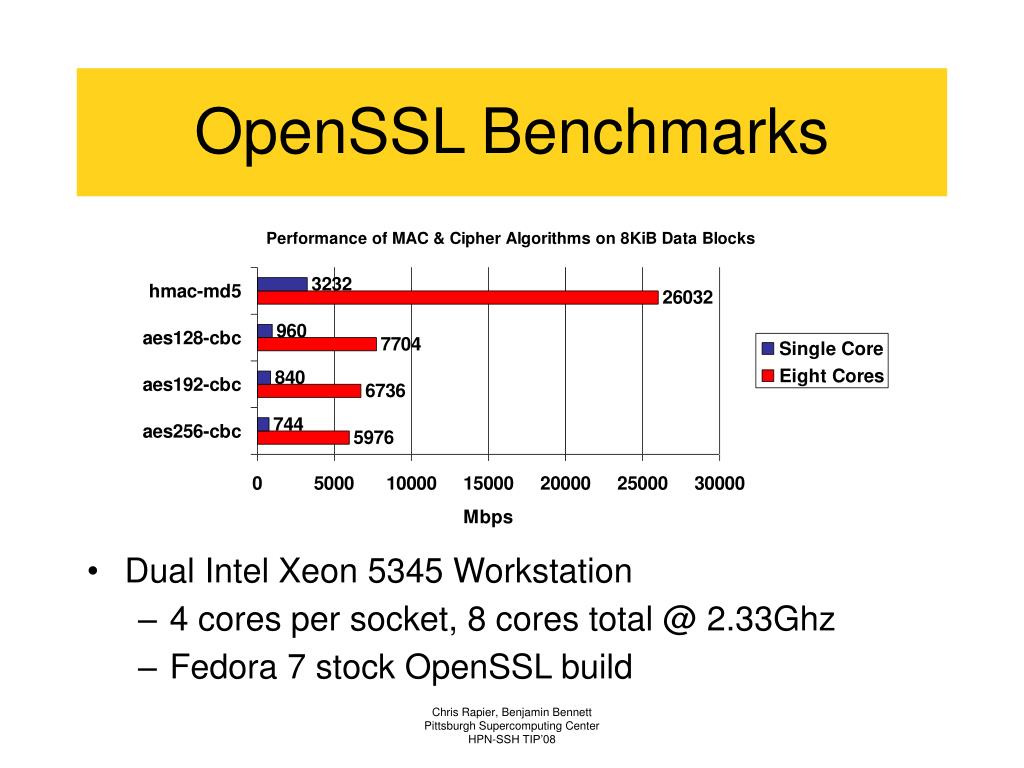 OpenSSL Benchmarks • Dual Intel Xeon 5345 Workstation • 4 cores per socket, 8 cores total @ 2.33Ghz • Fedora 7 stock OpenSSL build Chris Rapier, Benjamin Bennett Pittsburgh Supercomputing Center HPN-SSH TIP’08