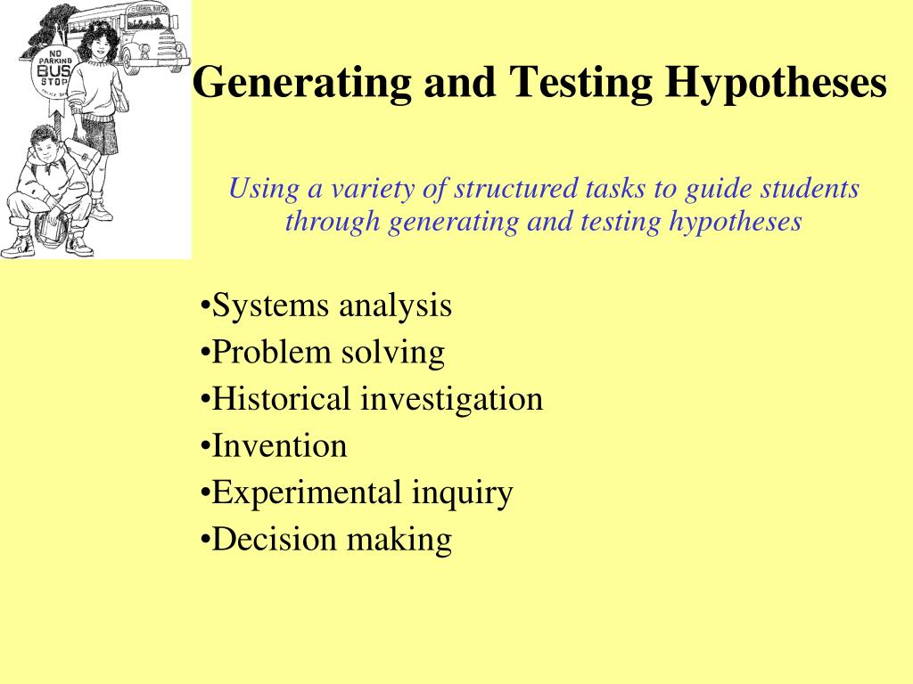 Generating and Testing Hypotheses • Using a variety of structured tasks to guide students through generating and testing hypotheses • Systems analysis • Problem solving • Historical investigation • Invention • Experimental inquiry • Decision making