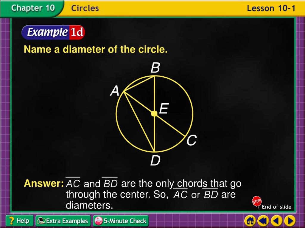 Answer: are the only chords that go through the center. So, are diameters. Example 1-1d Name a diameter of the circle.