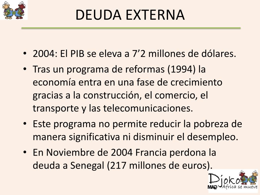 DEUDA EXTERNA • 2004: El PIB se eleva a 7’2 millones de dólares. • Tras un programa de reformas (1994) la economía entra en una fase de crecimiento gracias a la construcción, el comercio, el transporte y las telecomunicaciones. • Este programa no permite reducir la pobreza de manera significativa ni disminuir el desempleo. • En Noviembre de 2004 Francia perdona la deuda a Senegal (217 millones de euros).