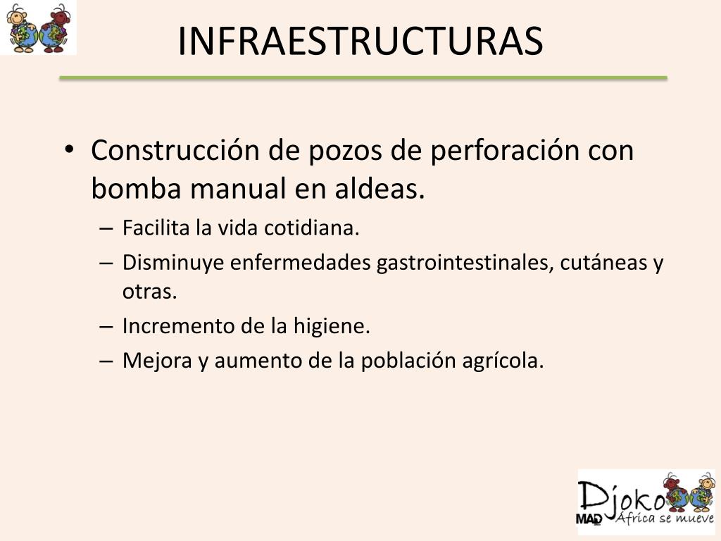 INFRAESTRUCTURAS • Construcción de pozos de perforación con bomba manual en aldeas. • Facilita la vida cotidiana. • Disminuye enfermedades gastrointestinales, cutáneas y otras. • Incremento de la higiene. • Mejora y aumento de la población agrícola.