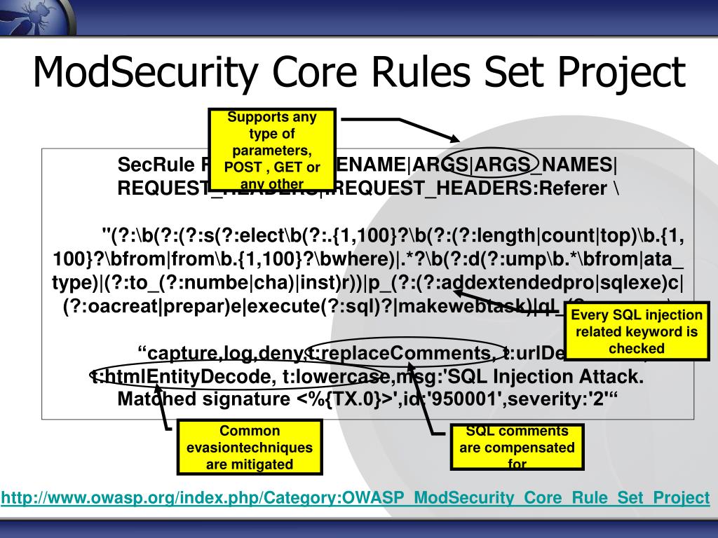ModSecurity Core Rules Set Project Supports any type of parameters, POST , GET or any other SecRule REQUEST_FILENAME|ARGS|ARGS_NAMES|REQUEST_HEADERS|!REQUEST_HEADERS:Referer \ "(?:\b(?:(?:s(?:elect\b(?:.{1,100}?\b(?:(?:length|count|top)\b.{1,100}?\bfrom|from\b.{1,100}?\bwhere)|.*?\b(?:d(?:ump\b.*\bfrom|ata_type)|(?:to_(?:numbe|cha)|inst)r))|p_(?:(?:addextendedpro|sqlexe)c|(?:oacreat|prepar)e|execute(?:sql)?|makewebtask)|ql_(?:… … … \ “capture,log,deny,t:replaceComments, t:urlDecodeUni, t:htmlEntityDecode, t:lowercase,msg:'SQL Injection Attack. Matched signature <%{TX.0}>',id:'950001',severity:'2'“ Every SQL injection related keyword is checked Common evasiontechniques are mitigated SQL comments are compensated for http://www.owasp.org/index.php/Category:OWASP_ModSecurity_Core_Rule_Set_Project