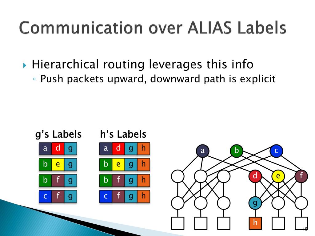 Communication over ALIAS Labels • Hierarchical routing leverages this info • Push packets upward, downward path is explicit g’s Labels h’s Labels a b c d e f e e g g h f f g g h d d g g h f f g g h b b c c a a b b g h