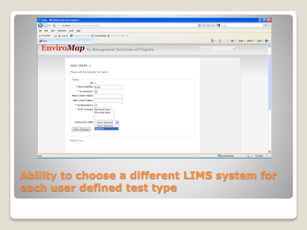 Automatic submission & results retrieval from external LIMS systems • Integration via web services, ftp, or email in the following formats: xml, csv, or xls • Ability to choose a different LIMS system for each user defined test type • Supports & displays external LIMS reference numbers LIMS Integration Summary