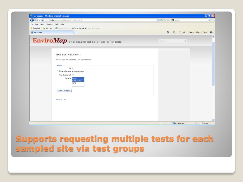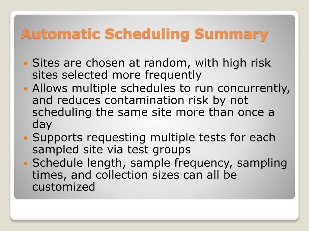 Sites are chosen at random, with high risk sites selected more frequently • Allows multiple schedules to run concurrently, and reduces contamination risk by not scheduling the same site more than once a day • Supports requesting multiple tests for each sampled site via test groups • Schedule length, sample frequency, sampling times, and collection sizes can all be customized Automatic Scheduling Summary