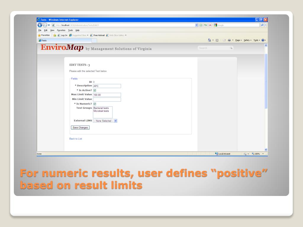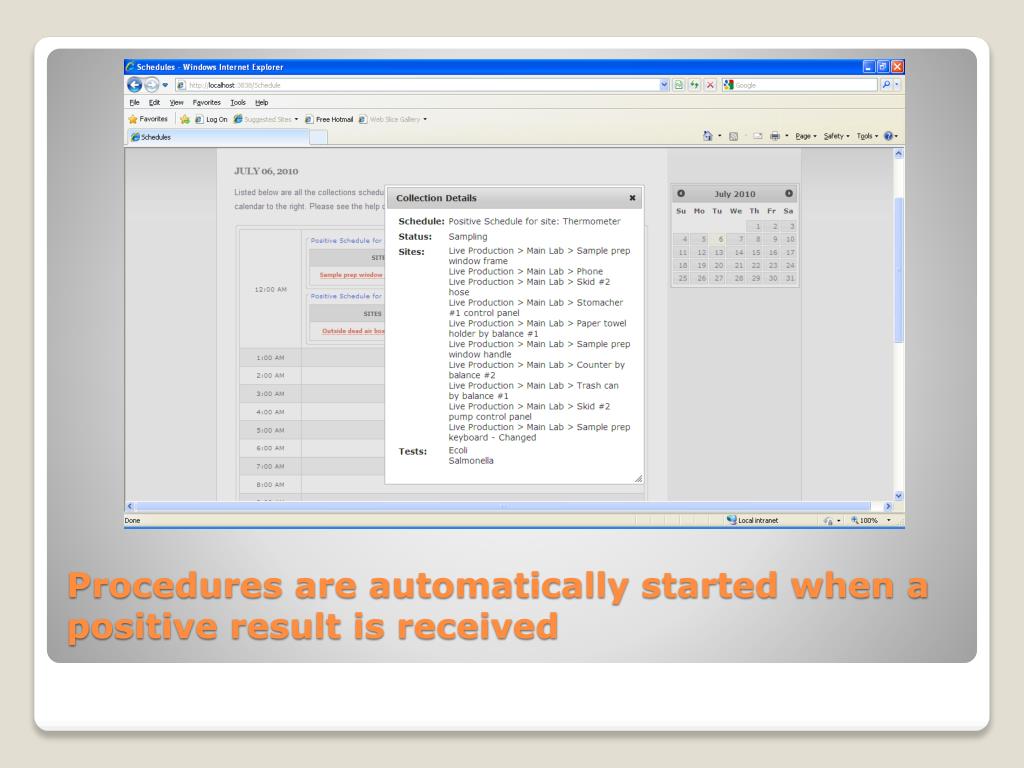Procedures are automatically started when a positive result is received • Separate procedures can be defined based on positive iteration (1st positive vs. 2nd positive) • Procedures run for user defined length of time, number of negatives, or until all sites have been sampled • For numeric results, user defines “positive” based on result limits Positive Result Procedures Summary