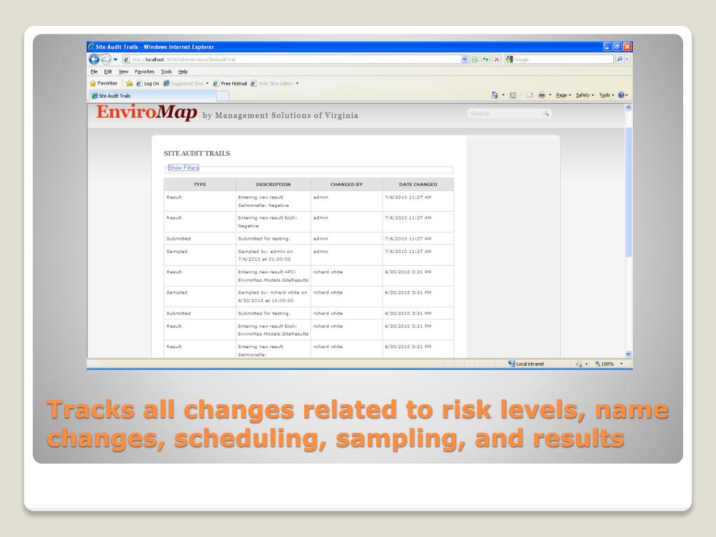 Complete audit trail for every site in the system • Tracks all changes related to risk levels, name changes, scheduling, sampling, and results • Filter by event type, user or date range Site Audit Trail Summary