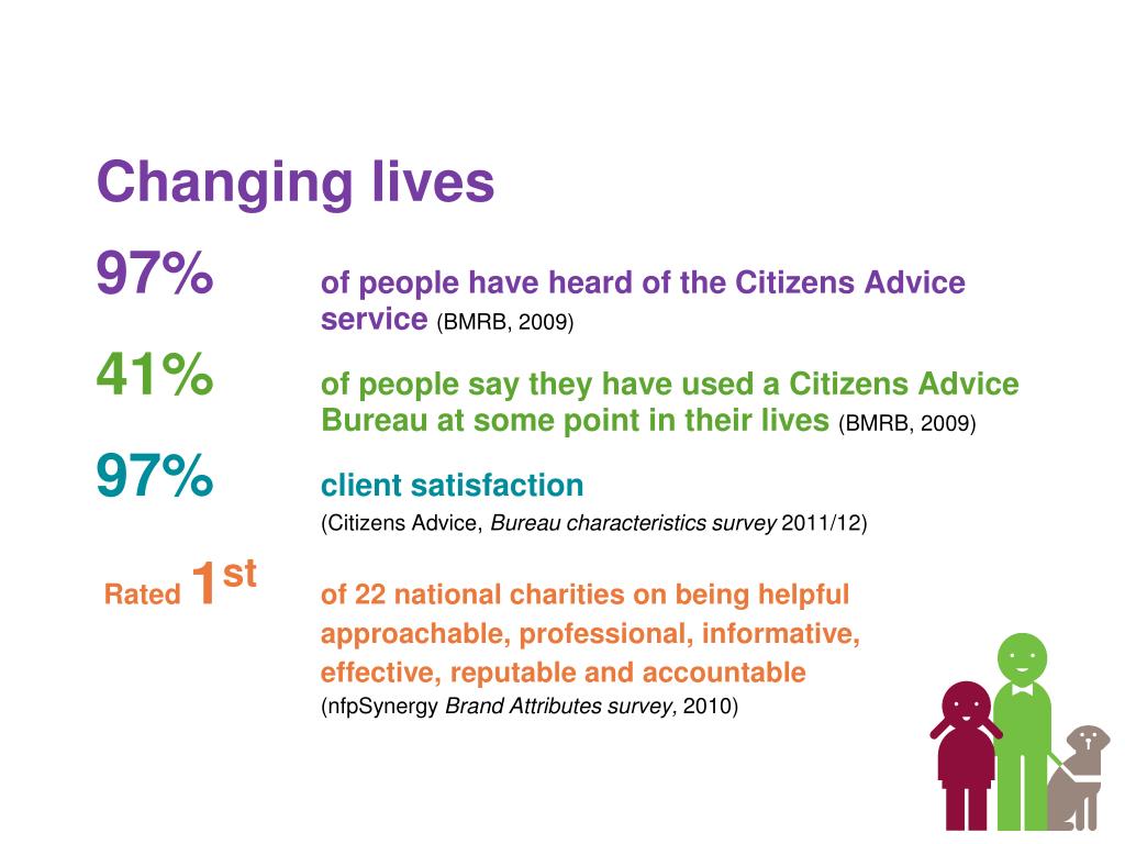 Changing lives 97%of people have heard of the Citizens Advice service(BMRB, 2009) 41%of people say they have used a Citizens Advice Bureau at some point in their lives(BMRB, 2009) 97%client satisfaction (Citizens Advice, Bureau characteristics survey 2011/12) Rated 1stof 22 national charities on being helpful approachable, professional, informative, effective, reputable and accountable (nfpSynergy Brand Attributes survey, 2010)