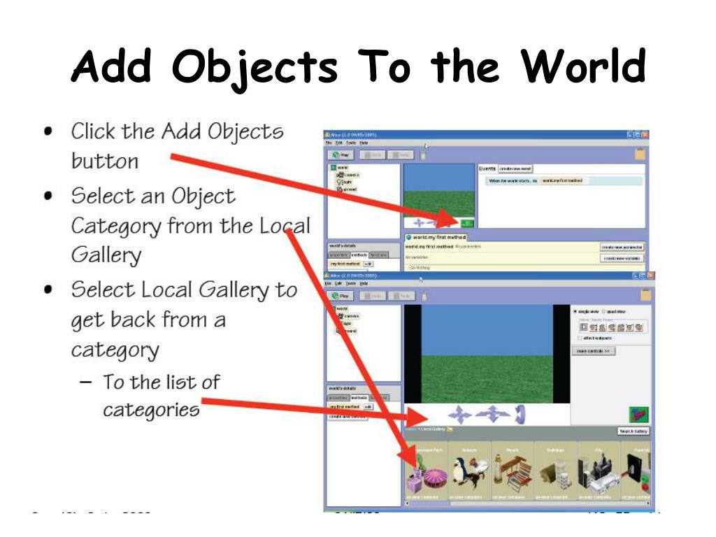 Add Objects to the World • Select an object to add – Click on object to select • Click Add Instance to world Button – Or drag the object and drop it into position somewhere in the world