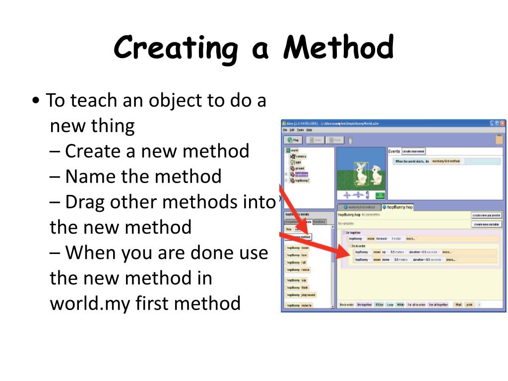 Objects do Things in Methods • In object-oriented programming we ask objects to do things – They are born ‘knowing’ some things – We can teach them new things • In Alice we will do this in a method – A named set of requests to objects – The play button executes • world.my first method