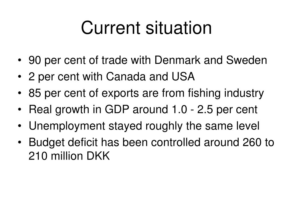Current situation • 90 per cent of trade with Denmark and Sweden • 2 per cent with Canada and USA • 85 per cent of exports are from fishing industry • Real growth in GDP around 1.0 - 2.5 per cent • Unemployment stayed roughly the same level • Budget deficit has been controlled around 260 to 210 million DKK