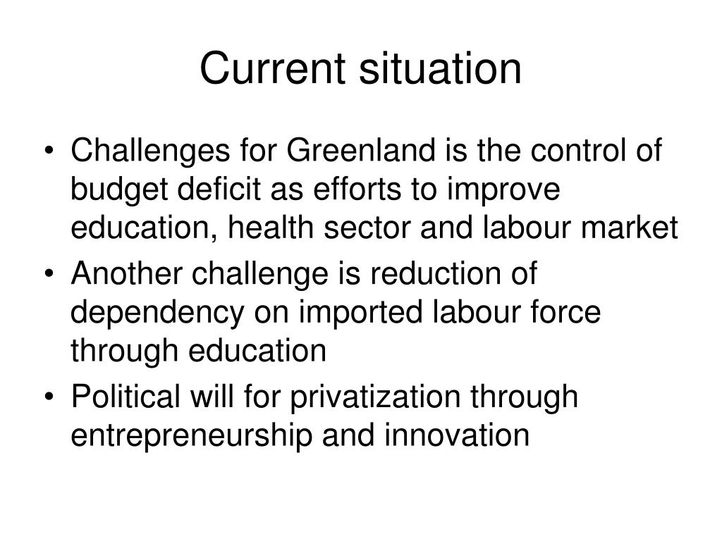Current situation • Challenges for Greenland is the control of budget deficit as efforts to improve education, health sector and labour market • Another challenge is reduction of dependency on imported labour force through education • Political will for privatization through entrepreneurship and innovation