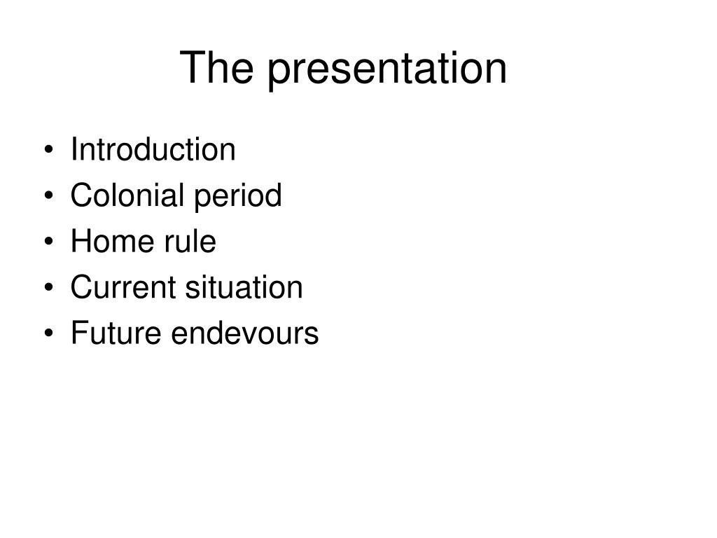 The presentation • Introduction • Colonial period • Home rule • Current situation • Future endevours