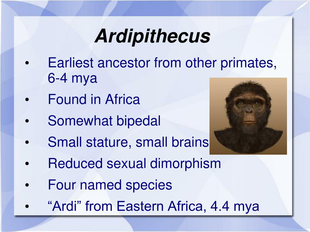 Ardipithecus • Earliest ancestor from other primates, 6-4 mya • Found in Africa • Somewhat bipedal • Small stature, small brains • Reduced sexual dimorphism • Four named species • “Ardi” from Eastern Africa, 4.4 mya