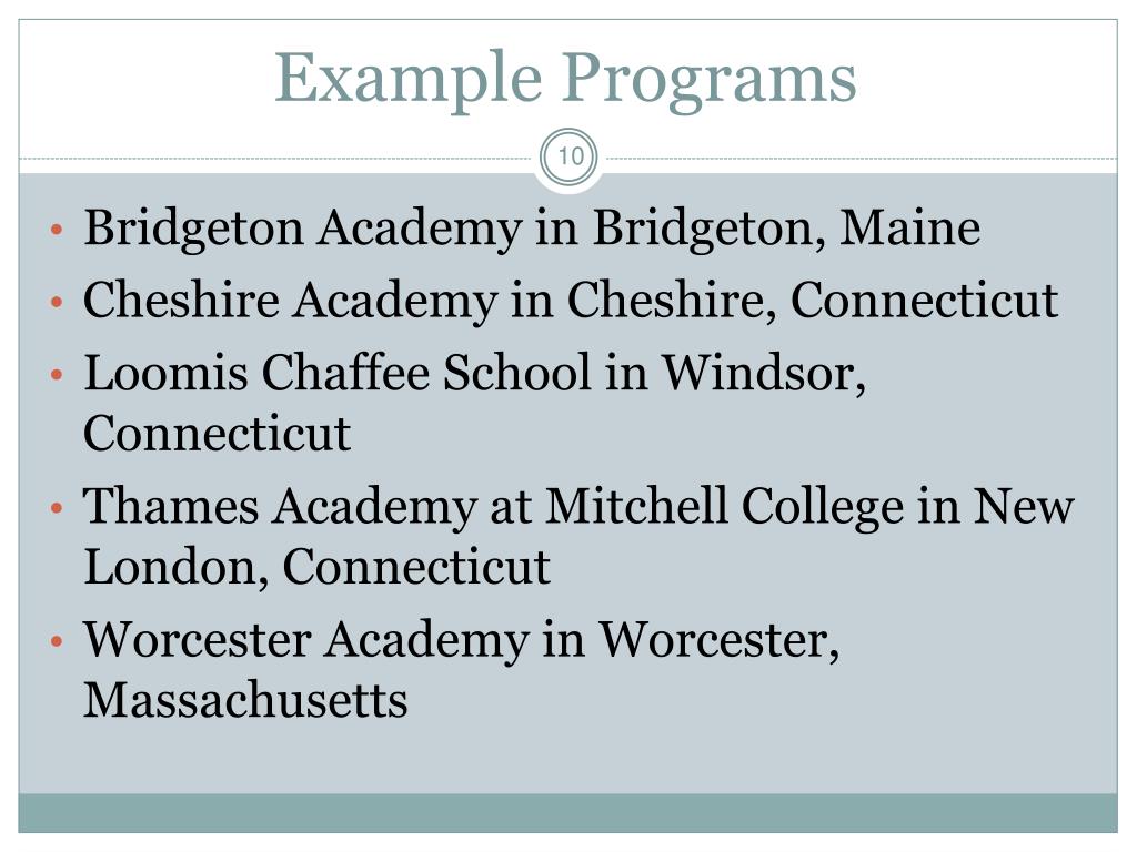 Example Programs • Bridgeton Academy in Bridgeton, Maine • Cheshire Academy in Cheshire, Connecticut • Loomis Chaffee School in Windsor, Connecticut • Thames Academy at Mitchell College in New London, Connecticut • Worcester Academy in Worcester, Massachusetts