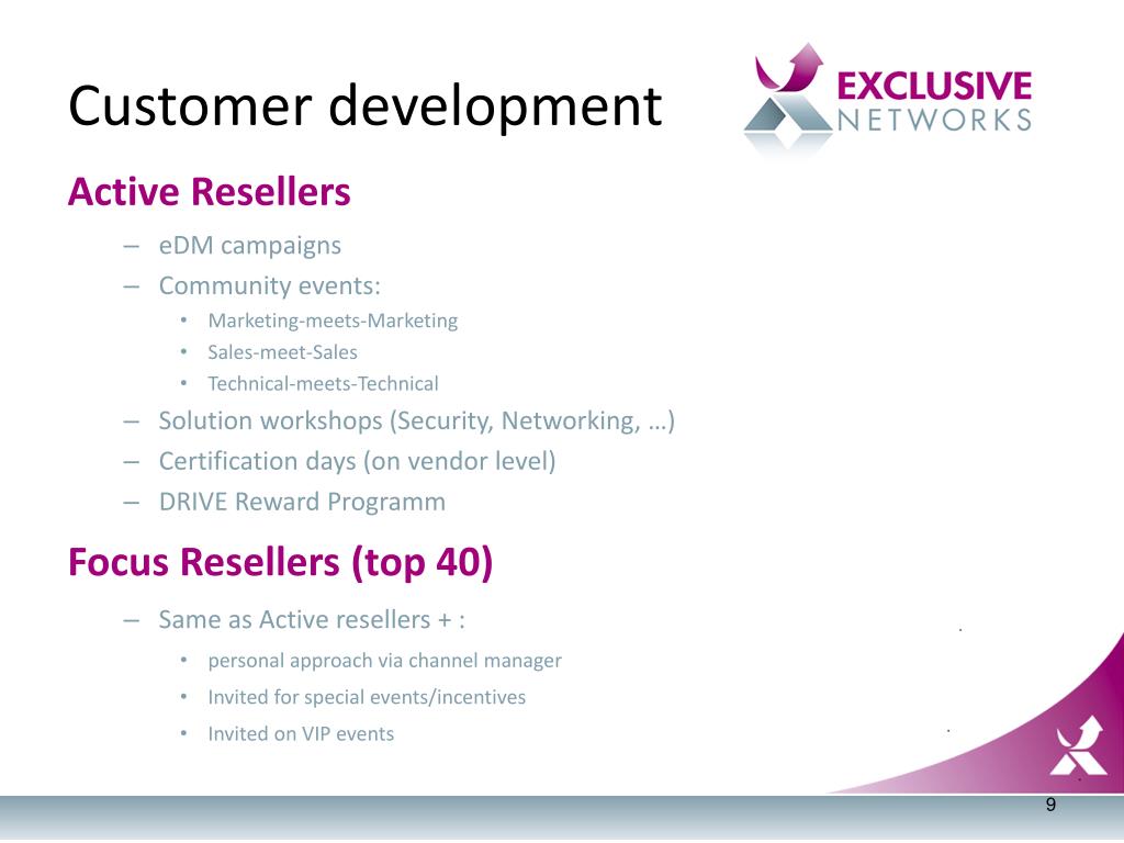 Customer development Active Resellers • eDMcampaigns • Community events: • Marketing-meets-Marketing • Sales-meet-Sales • Technical-meets-Technical • Solution workshops (Security, Networking, …) • Certificationdays (on vendor level) • DRIVE RewardProgramm Focus Resellers (top 40) • Same as Active resellers + : • personal approach via channel manager • Invitedfor special events/incentives • Invited on VIP events