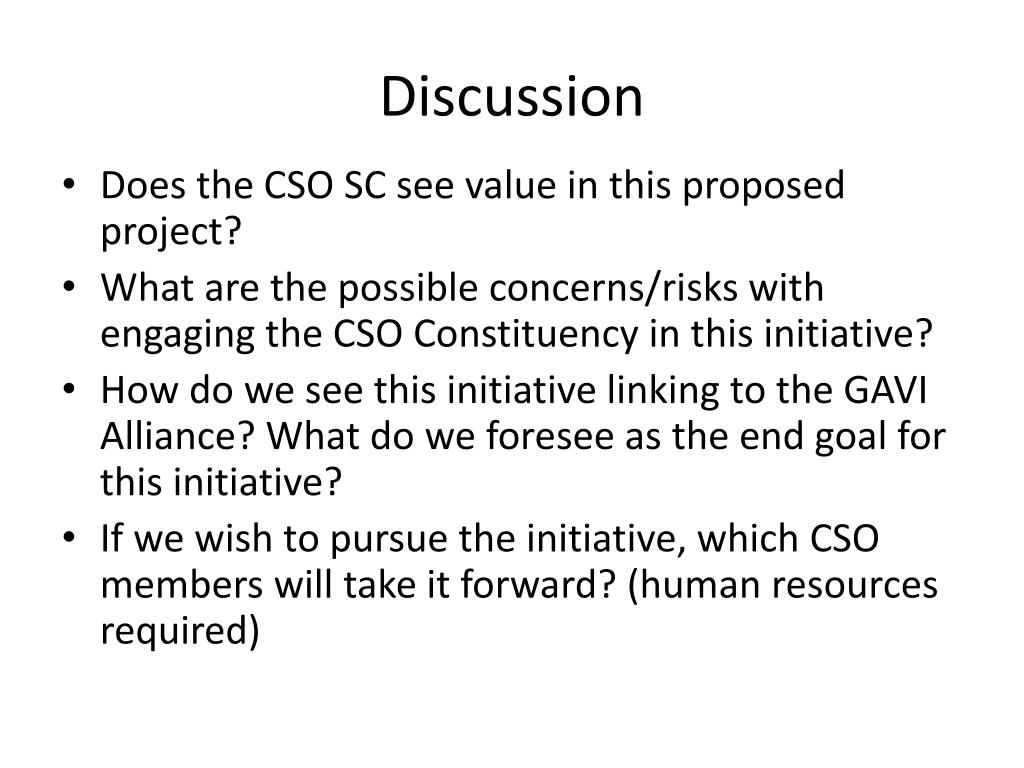 Discussion • Does the CSO SC see value in this proposed project? • What are the possible concerns/risks with engaging the CSO Constituency in this initiative? • How do we see this initiative linking to the GAVI Alliance? What do we foresee as the end goal for this initiative? • If we wish to pursue the initiative, which CSO members will take it forward? (human resources required)