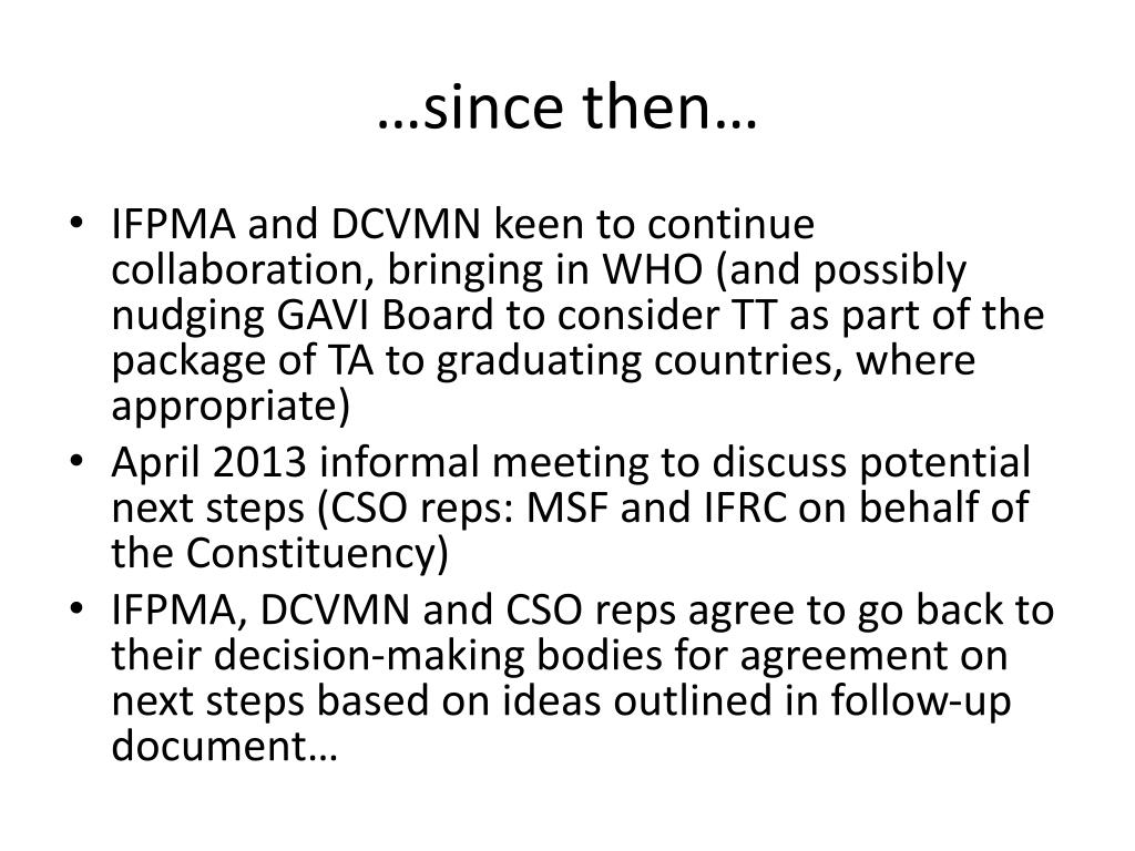 …since then… • IFPMA and DCVMN keen to continue collaboration, bringing in WHO (and possibly nudging GAVI Board to consider TT as part of the package of TA to graduating countries, where appropriate) • April 2013 informal meeting to discuss potential next steps (CSO reps: MSF and IFRC on behalf of the Constituency) • IFPMA, DCVMN and CSO reps agree to go back to their decision-making bodies for agreement on next steps based on ideas outlined in follow-up document…