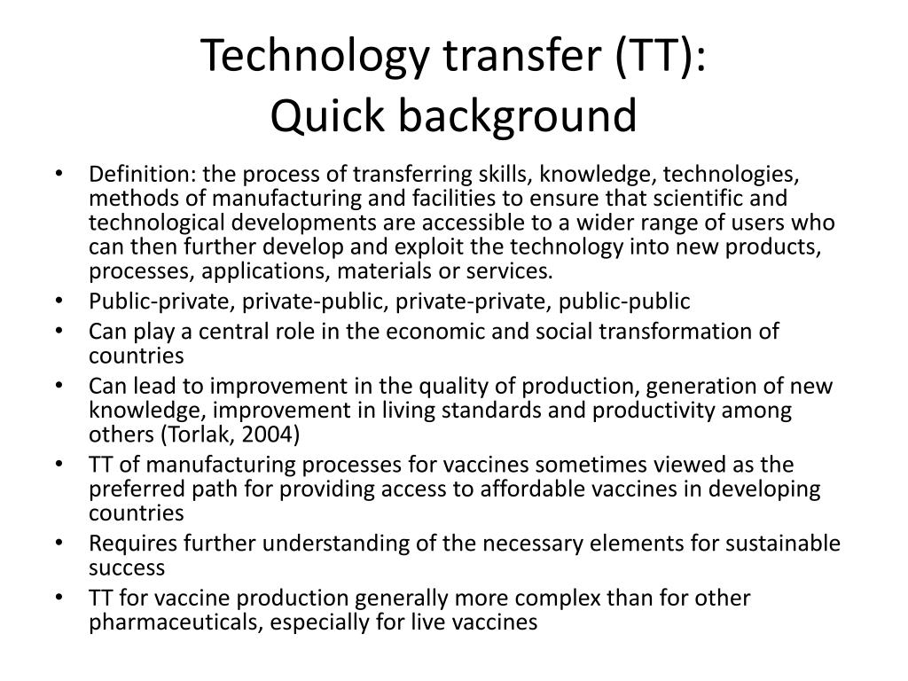 Technology transfer (TT): Quick background • Definition: the process of transferring skills, knowledge, technologies, methods of manufacturing and facilities to ensure that scientific and technological developments are accessible to a wider range of users who can then further develop and exploit the technology into new products, processes, applications, materials or services. • Public-private, private-public, private-private, public-public • Can play a central role in the economic and social transformation of countries • Can lead to improvement in the quality of production, generation of new knowledge, improvement in living standards and productivity among others (Torlak, 2004) • TT of manufacturing processes for vaccines sometimes viewed as the preferred path for providing access to affordable vaccines in developing countries • Requires further understanding of the necessary elements for sustainable success • TT for vaccine production generally more complex than for other pharmaceuticals, especially for live vaccines