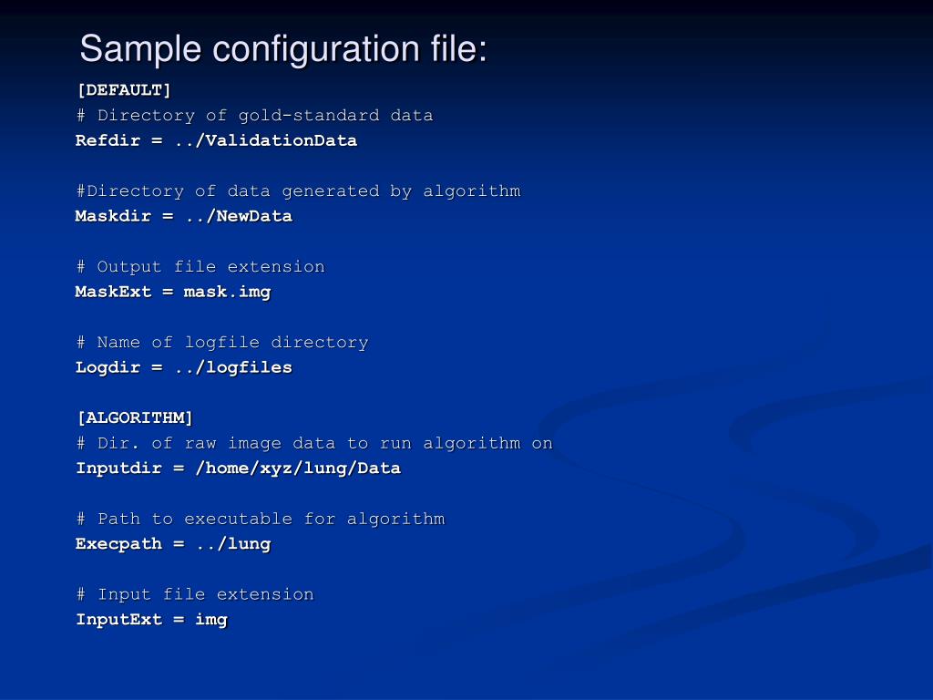 Sample configuration file: [DEFAULT] # Directory of gold-standard data Refdir = ../ValidationData #Directory of data generated by algorithm Maskdir = ../NewData # Output file extension MaskExt = mask.img # Name of logfile directory Logdir = ../logfiles [ALGORITHM] # Dir. of raw image data to run algorithm on Inputdir = /home/xyz/lung/Data # Path to executable for algorithm Execpath = ../lung # Input file extension InputExt = img