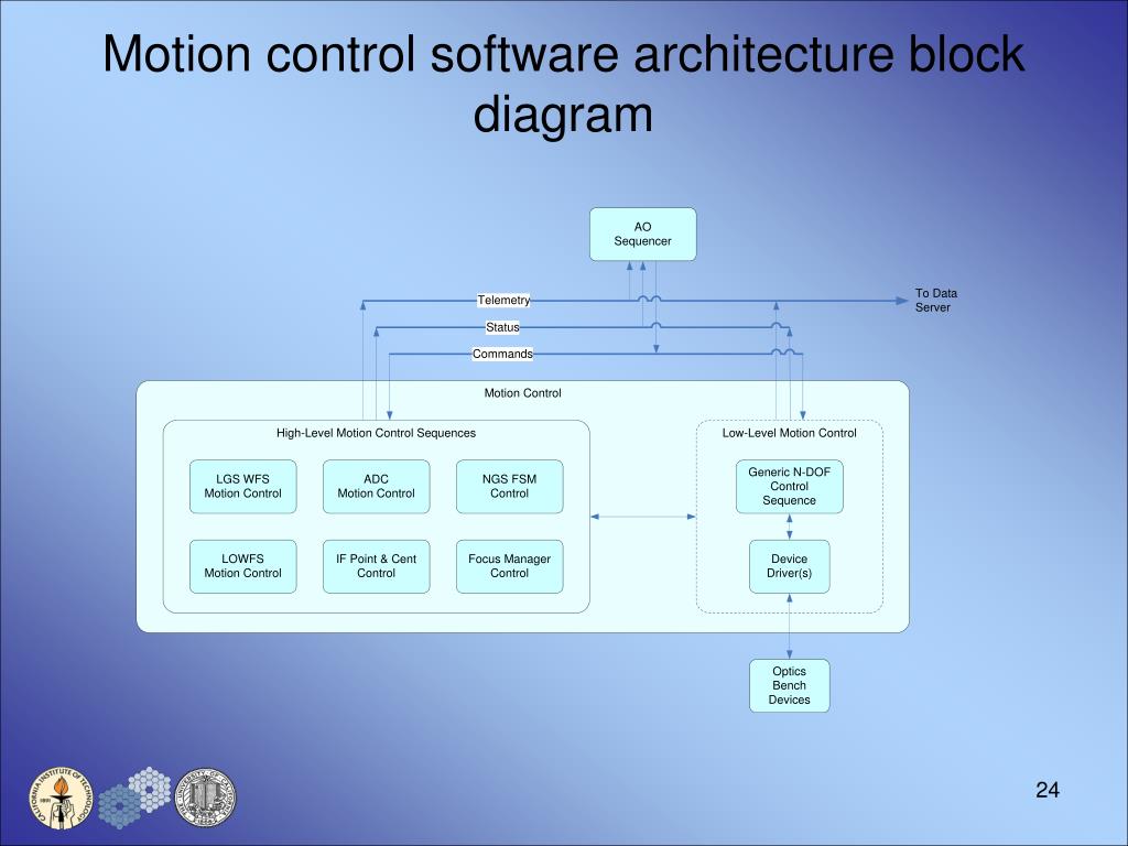 Motion Control • Vibration sensor (3 DOF) • Calibration source (4 DOF) • Rotator (1 DOF) • LGS WFS assembly (61 DOF) • Dichroic changer (2 DOF) • Interferometer pickoff, pointing and centering (5 DOF) • Acquisition camera pickoff, focus (2 DOF) • LOWFS assembly (22 DOF) • NGS WFS and truth sensor (14 DOF) • Visible imager (5 DOF) • NIR imager (3 DOF) • OSIRIS pickoff (1 DOF) • Laser pointing and centering (36 DOF) • Laser constellation generator (19 DOF) • Other laser motion control (11 DOF)