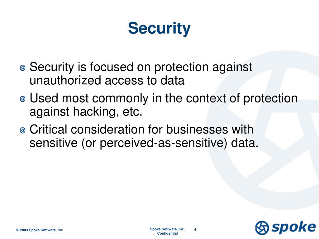 Security • Security is focused on protection against unauthorized access to data • Used most commonly in the context of protection against hacking, etc. • Critical consideration for businesses with sensitive (or perceived-as-sensitive) data. Spoke Software, Inc. Confidential