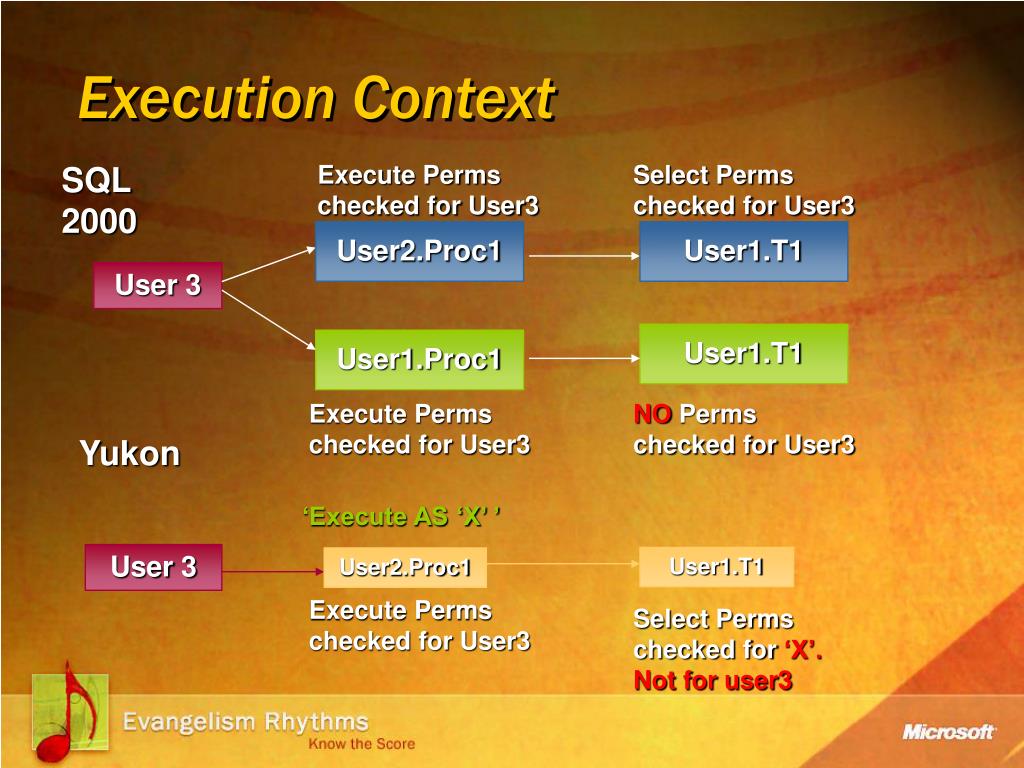 User2.Proc1 User1.T1 User 3 User1.T1 User2.Proc1 Execution Context SQL 2000 Execute Perms checked for User3 Select Perms checked for User3 User 3 User1.T1 User1.Proc1 Execute Perms checked for User3 NO Perms checked for User3 Yukon ‘Execute AS ‘X’ ’ Execute Perms checked for User3 Select Perms checked for‘X’. Not for user3