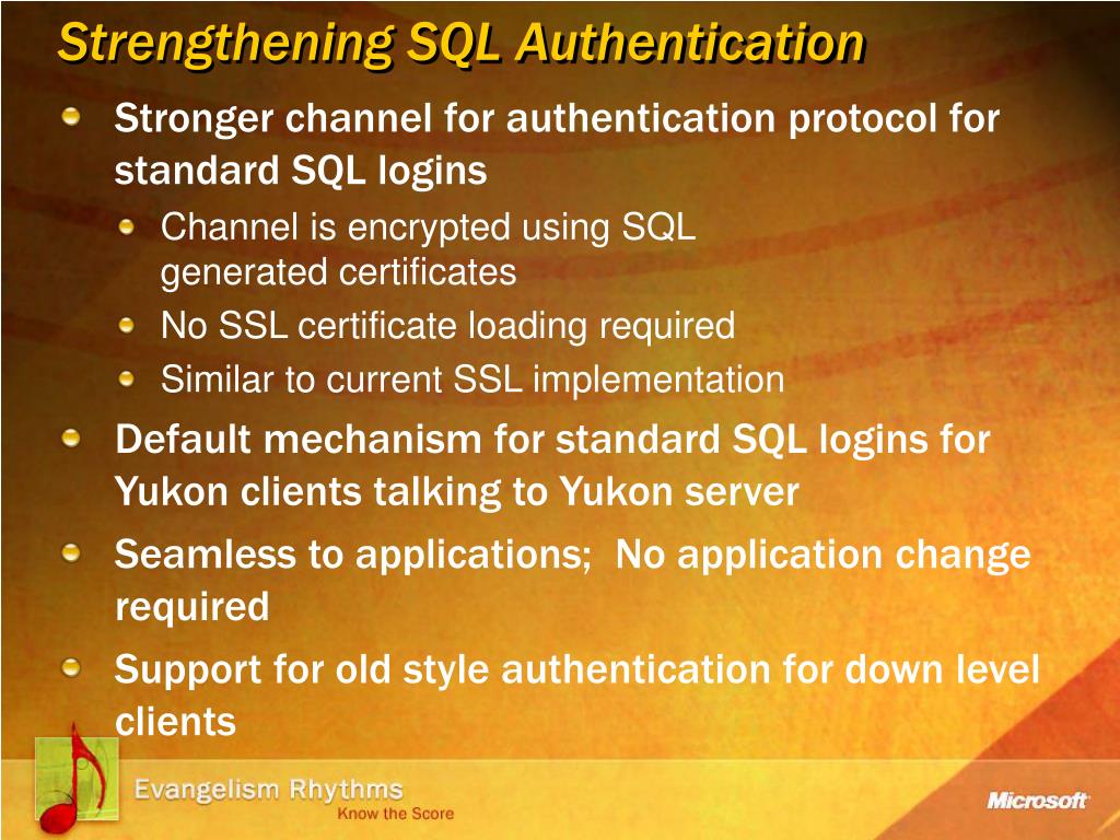 Strengthening SQL Authentication • Stronger channel for authentication protocol for standard SQL logins • Channel is encrypted using SQL generated certificates • No SSL certificate loading required • Similar to current SSL implementation • Default mechanism for standard SQL logins for Yukon clients talking to Yukon server • Seamless to applications; No application change required • Support for old style authentication for down level clients