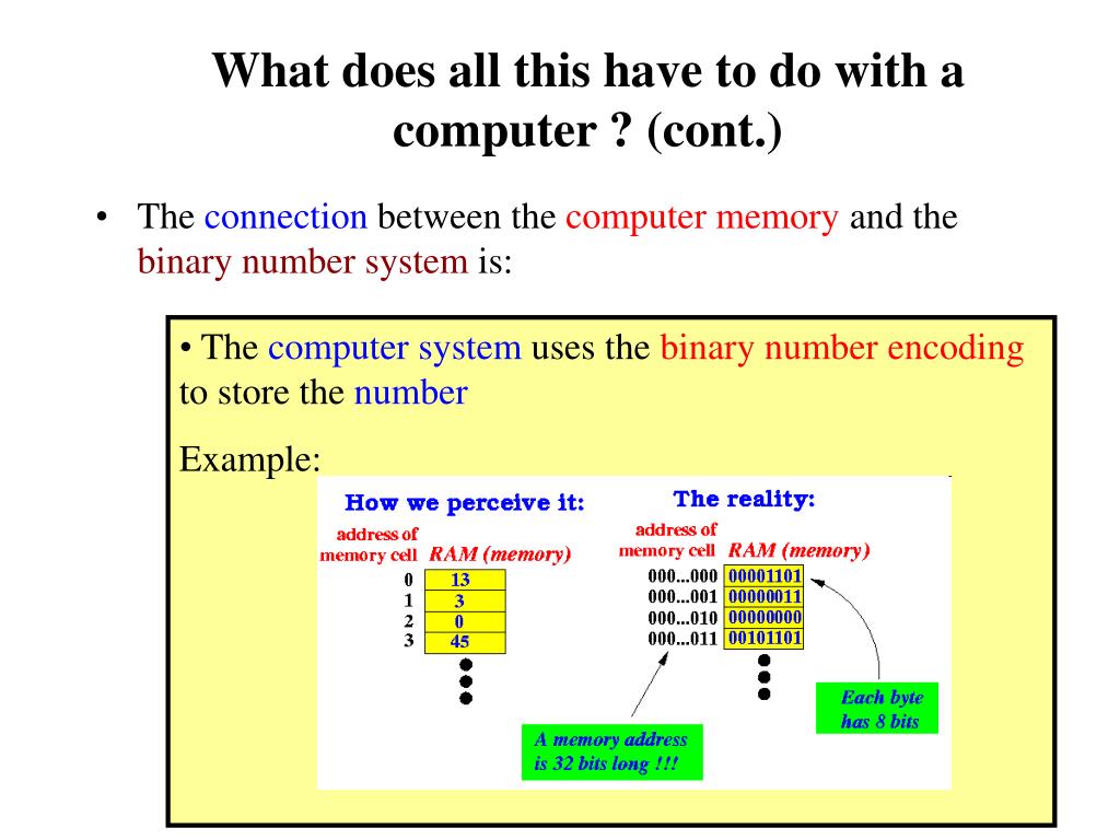 What does all this have to do with a computer ? (cont.) • Note: the address is also expressed as a binary number A computer can have over 4,000,000,000 bytes (4 Gigabytes) of memory. So we need a 32 bites to express the address