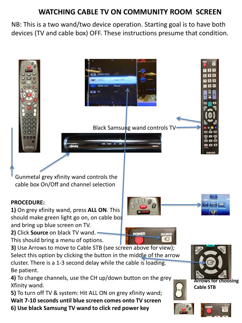 Follow these steps to operate cable TV on the community room screen using two devices - a Samsung TV wand and an Xfinity cable box wand. Turn both devices off easily.