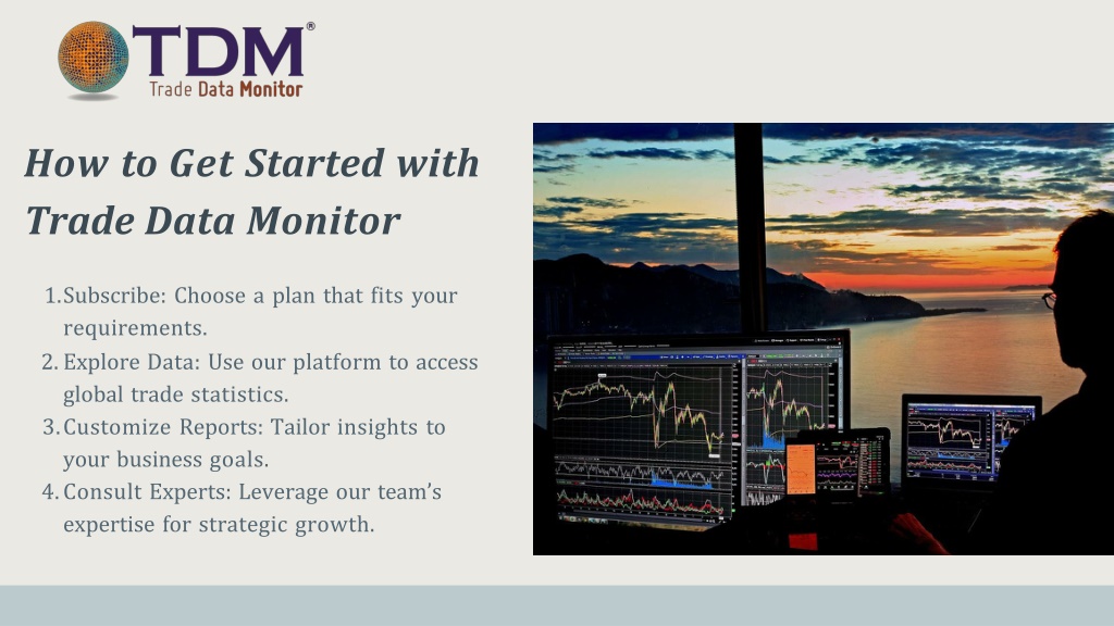 HowtoGetStartedwith TradeDataMonitor Subscribe:Chooseaplanthatfitsyour requirements. ExploreData:Useourplatformtoaccess globaltradestatistics. CustomizeReports:Tailorinsightsto yourbusinessgoals. ConsultExperts:Leverageourteam’s expertiseforstrategicgrowth.