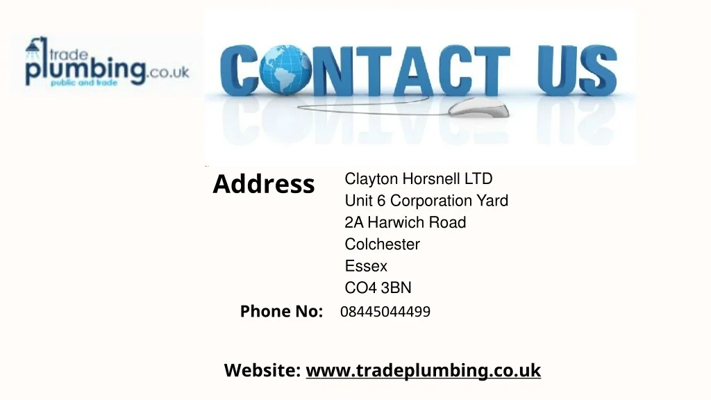 Address Clayton Horsnell LTD Unit 6 Corporation Yard 2A Harwich Road Colchester Essex CO43BN 08445044499 PhoneNo: Website: www.tradeplumbing.co.uk