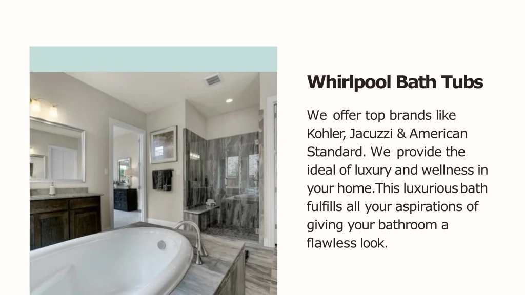 Whirlpool BathTubs We offer top brands like Kohler, Jacuzzi & American Standard. We provide the idealofluxuryandwellnessin your home.This luxuriousbath fulfills all your aspirations of giving your bathroom a flawlesslook.