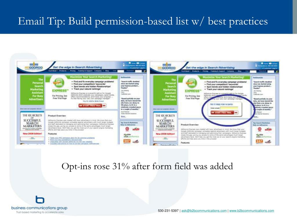 Email Tip: Build permission-based list w/ best practices Opt-ins rose 31% after form field was added